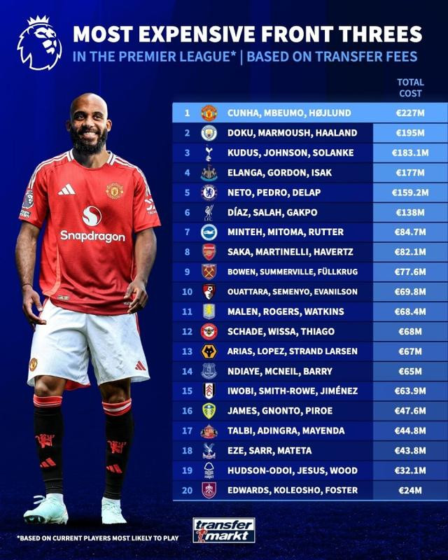 德转今日盘点了英超各队锋线三叉戟的转会费排名,其中曼联以2.27亿欧居首,曼城1.95亿欧第2。