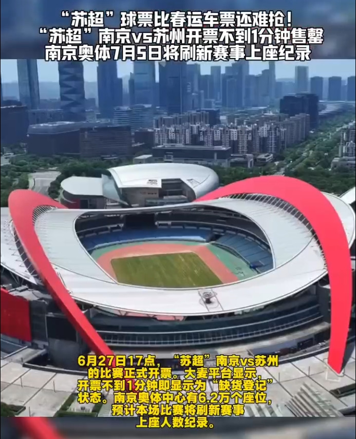 火爆明日苏超南京vs苏州, 预计超6万球迷涌入南京奥体&破纪录
