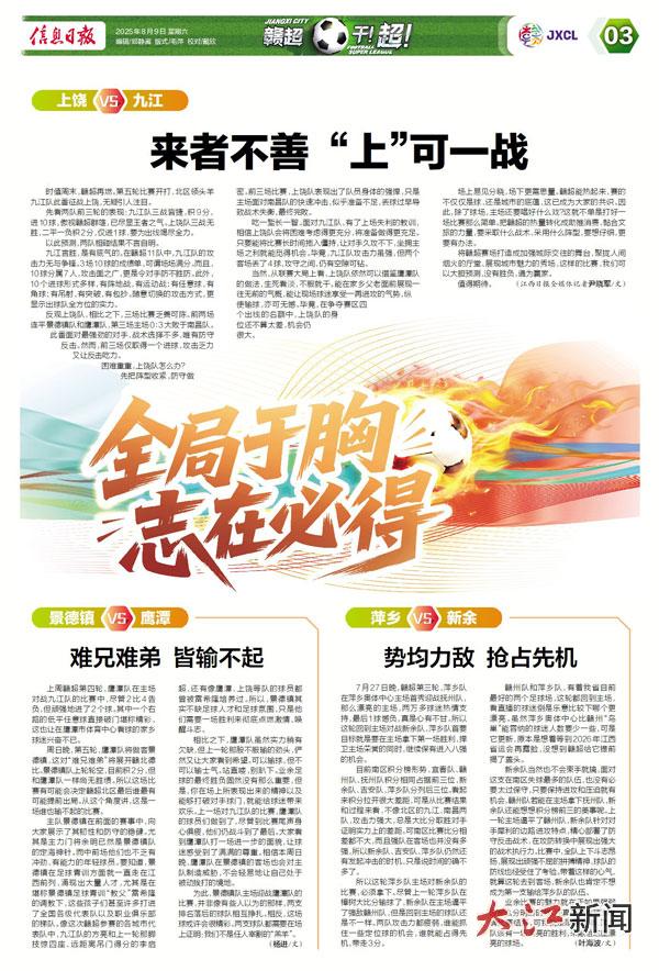 时值周末,赣超再燃。第五轮比赛开打,北区领头羊九江队此番征战上饶,无疑引人注目。