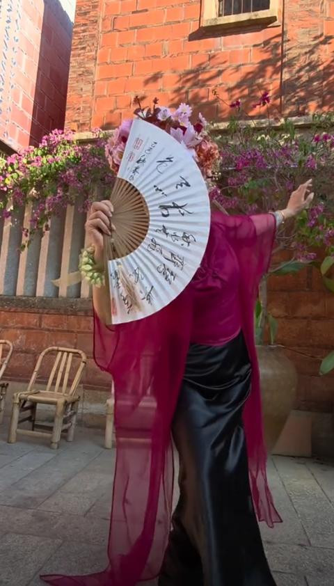 除此之外,何女士的手腕上还戴着当地比较火的茉莉花手串,拿着一把和手串颜色相同的扇子。