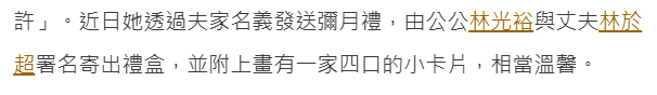 台媒指出,礼盒的署名是公公林光裕与丈夫林于超,或许这个细节又会让林依晨上热搜吧?