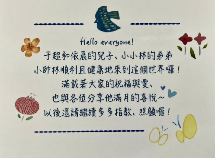 林依晨还在背面写道“Hello everyone!于超和依晨的儿子、小小林的弟弟小帅林顺利且健康地来到这个世界啰!满载着大家的祝福与爱、也与各位分享他满月的喜悦,以后还请继续多多指教、照顾啰!”