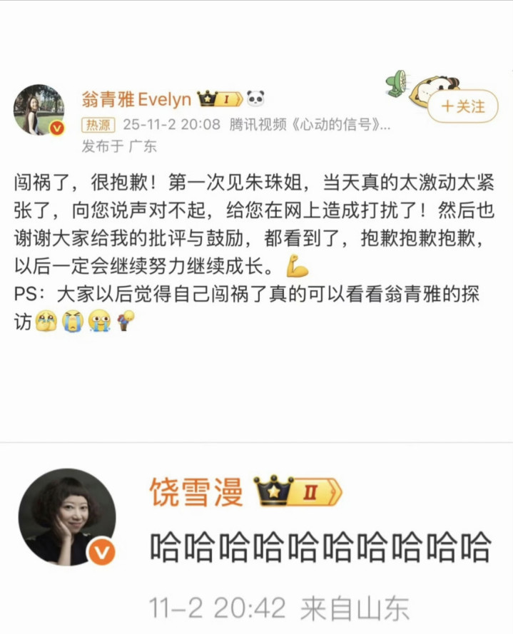 饶雪漫“哈哈哈”回复翁青雅道歉! 朱珠一句“翻儿了”被赞体面