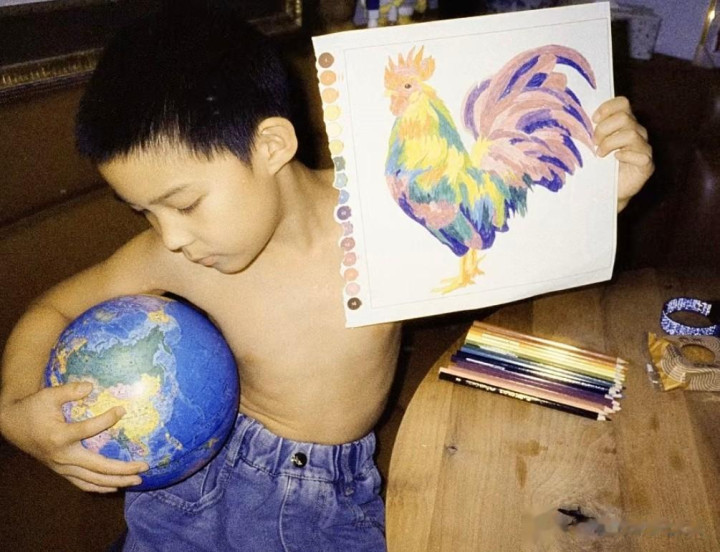 快快给弟弟阳阳拍的就很有生活气息了,大概是到了10岁开始有点小叛逆了,阳阳直接光膀子出镜,怀里抱着地球仪,手上还拿着自己的绘画作品展示,特意凹造型只给看侧脸,调皮的小男孩形象特别真实。